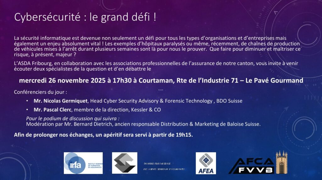 Nous aurons le privilège d’accueillir Mr. Nicolas Germiquet – Head Cyber Security Advisory & Forensic Technology. BDO Suisse – ainsi que Mr. Pascal Clerc – Membre de la direction Kessler & CO – qui débattront sur le thème de la « Cybersécurité : le grand défi ! ». Cette soirée sera modérée par Monsieur Bernard Dietrich (ancien Responsable Distribution & Marketing Baloise Suisse)